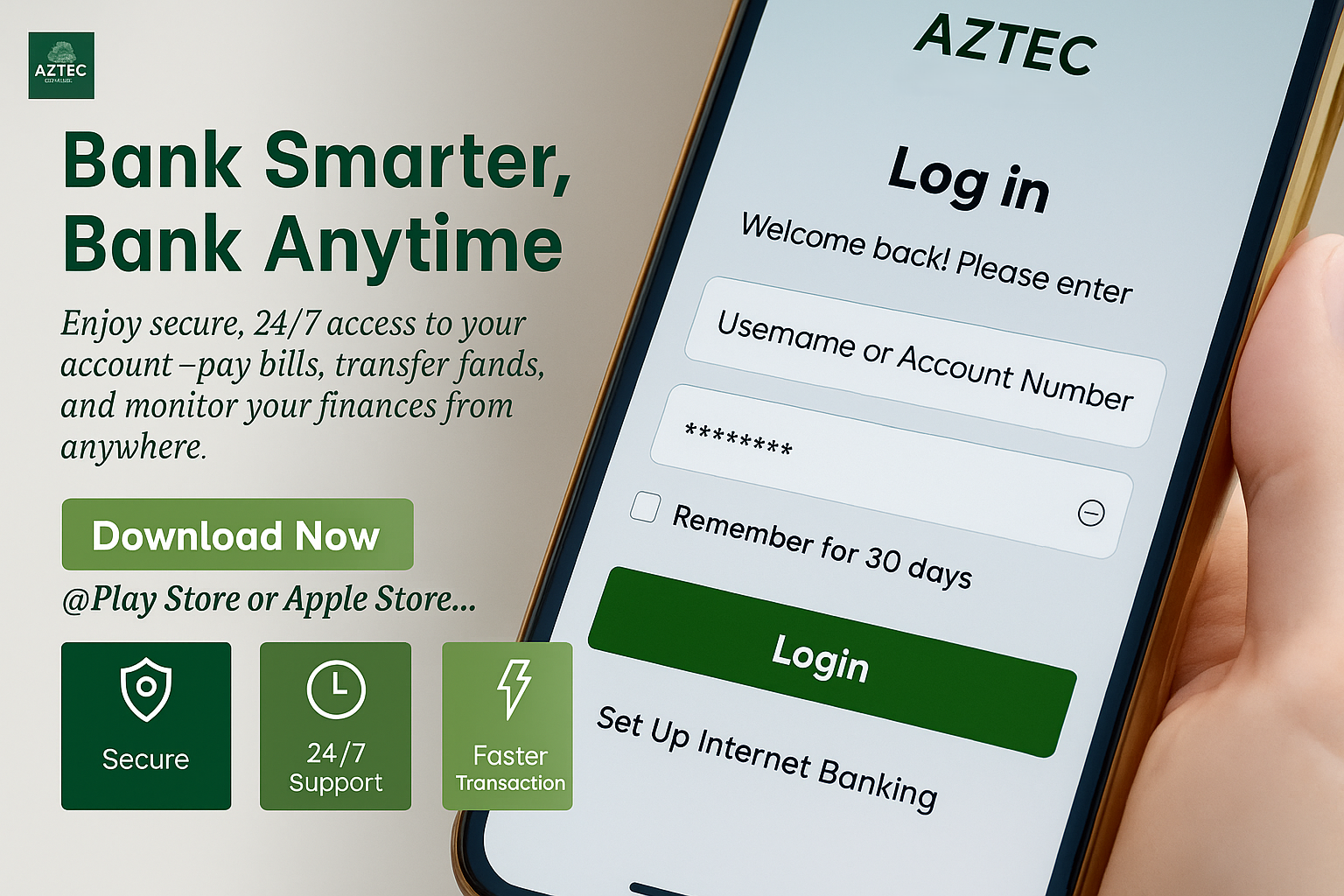 Our Internet Banking is designed to achieve simplified on-line real time services, Aztec Internet Banking offers branchless banking that is limitless, convenient and personalized. Enjoy self-service and access to our products anytime, anywhere. Kindly search Aztec MFB on Google Play Store / Apple Store.